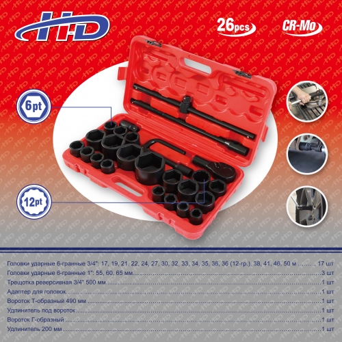 Набор инструментов ударных 26пр, 3/4" (6гр: 17-50мм, 12гр: 36мм) 1" (6гр: 55, 60, 65мм) CrMo "H-D"