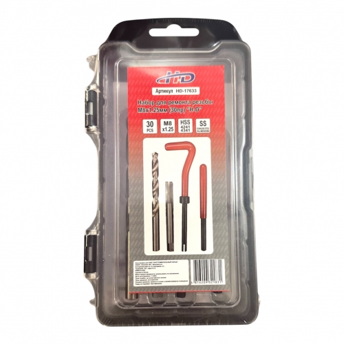 Ремонтный комплект для резьбы HD-17633 — это комплексное решение для устранения повреждений резьбы M8x1,25 мм. Быстро и эффективно восстанавливает первоначальную прочность соединений.
