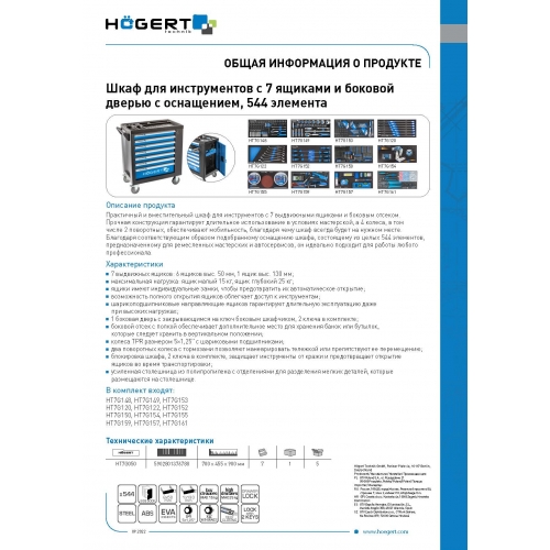 Практичный и вместительный шкаф для инструментов с 7 выдвижными ящиками и боковым отсеком. Прочная конструкция гарантирует длительное использование в условиях мастерской, а 4 колеса, в том числе 2 поворотных, обеспечивают мобильность, благодаря чему шкаф всегда будет на нужном месте. Благодаря соответствующим образом подобранному оснащению шкафа, состоящему из целых 544 элементов, предназначенному для ремесленных мастерских и автосервисов, он идеально подходит для работы любого профессионала.